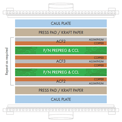 Image transfer is a condition that refers to an outer-layer of a circuit board displaying the image of the adjacent circuit layer, coming out of lamination. This condition causes uneven topography on the copper surface, which could result in poor-dry-film adhesion, and uneven plating. These defects can lead to increased scrap and poor yields related to shorts. One of the root causes of image transfer is heavier copper traces. ACF addresses this issue by utilizing hardened steel separators.